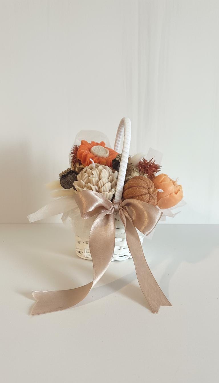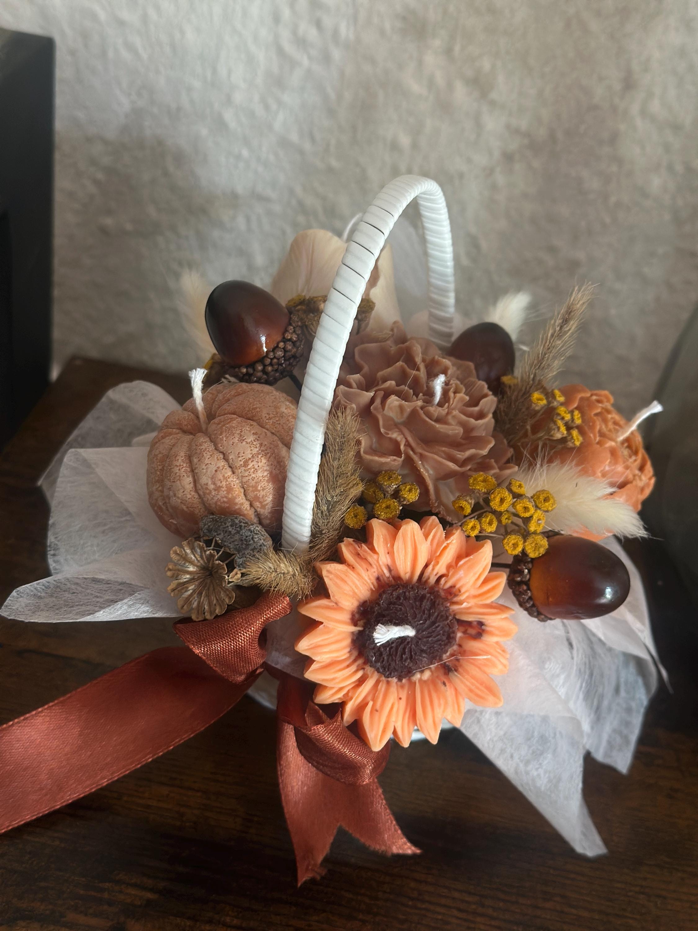 Ein liebevoll arrangiertes Körbchen mit handgegossenen Blütenkerzen und herbstlicher Deko. Erdige Töne und Düfte wie Pumpkin Spice Latte oder Vanille-Bourbon verzaubern dein Zuhause mit langanhaltender Wirkung – auch ohne Flamme. Wähle deine Lieblingsfarbe und deinen Lieblingsduft. Jedes Körbchen ist ein Unikat.Herbstglück im Körbchen. - Handgegossen aus Bio-Sojawachs