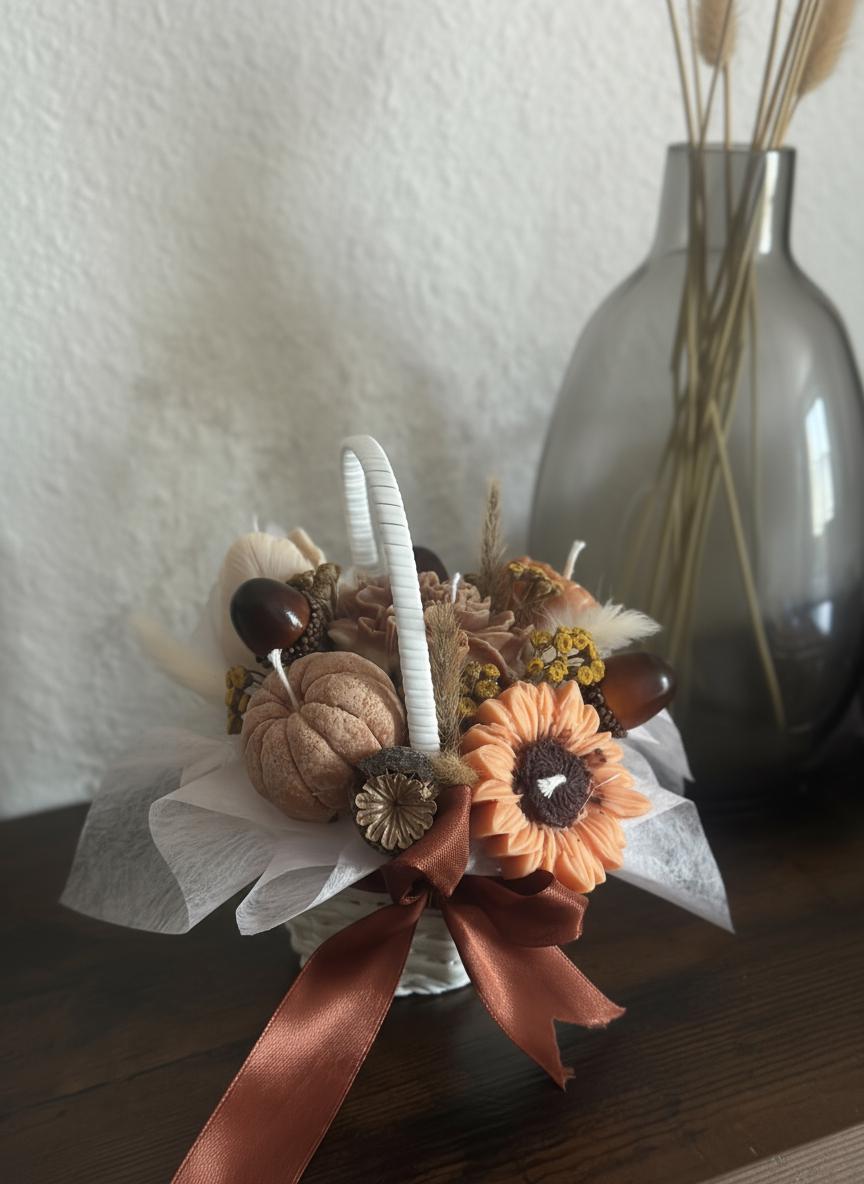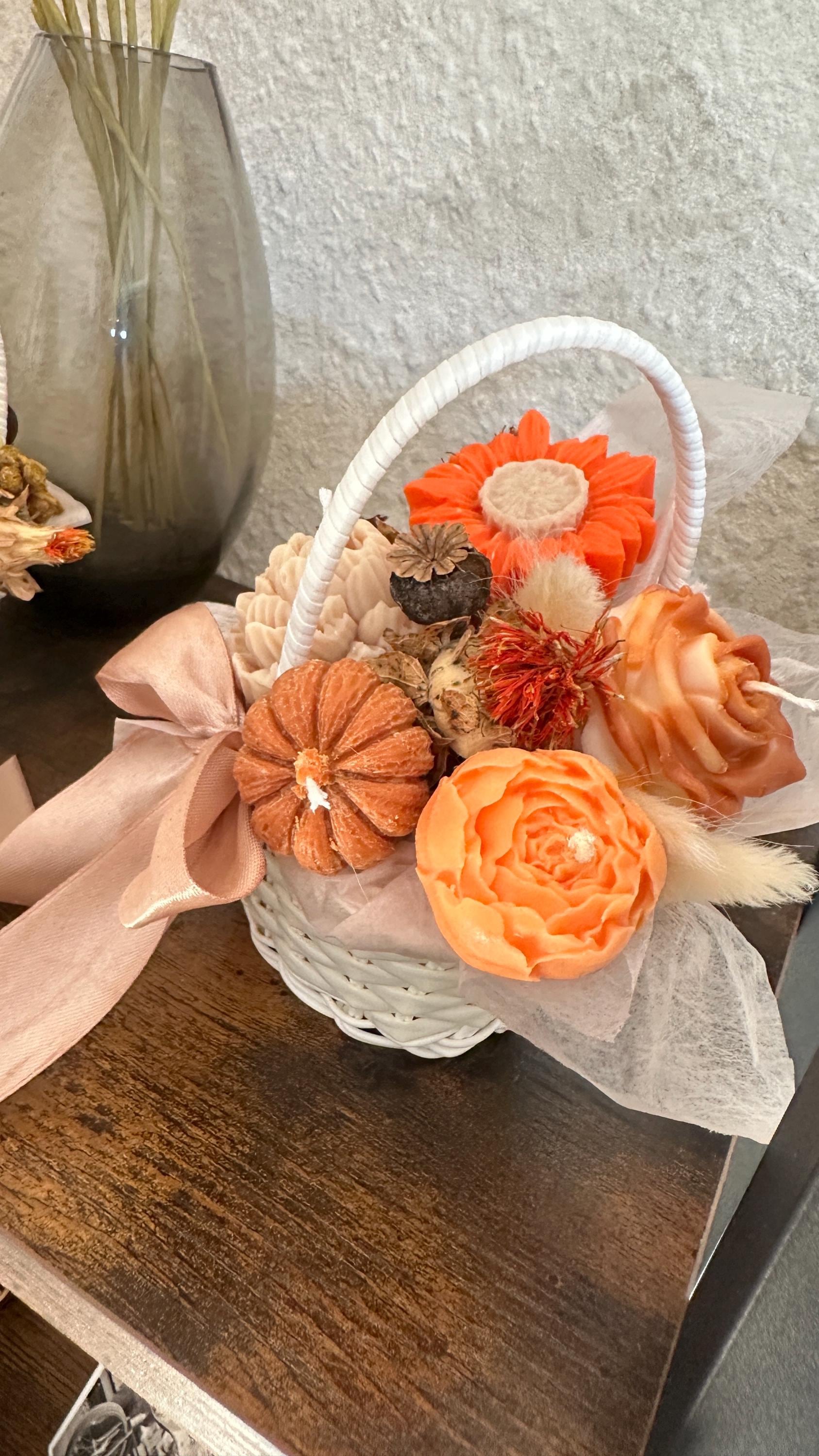 🧺🍁🕯️Dieser handgemachte Deko-Korb ist gefüllt mit liebevoll gegossenen Bio-Sojawachskerzen – jede in Form einer herbstlichen Blüte. Der Duft von Pumpkin Latte erfüllt den Raum mit wohliger Wärme und macht Lust auf Kuscheldecken & Teeabende. 🤎 Ein Stück Herbstmagie – nachhaltig, stilvoll und einzigartig 🌾Ein Blumenstrauß, der dein Zuhause zum Duften bringt – ganz ohne ihn anzuzünden. 🌸✨